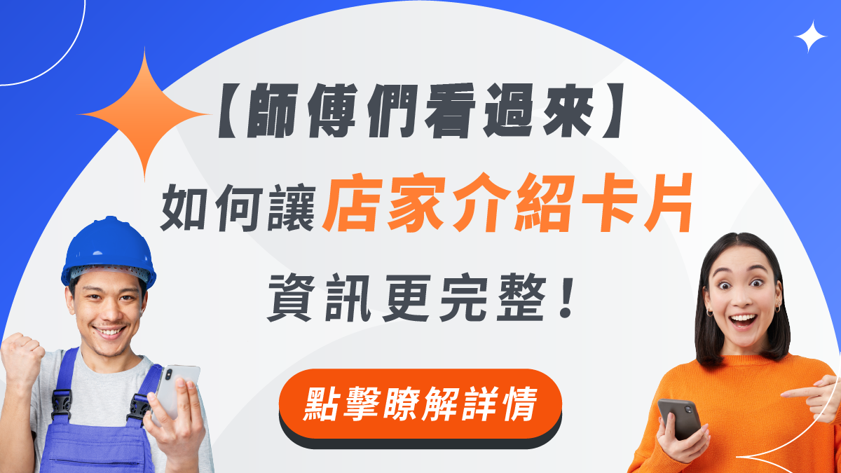 人氣:1180 #最新消息 【師傅們看過來】如何讓店家介紹卡片資訊更完整? 店家介紹卡片提供了業主最想了解的資訊,能讓業主快速了解您,並且提高回覆率以及成交率。店家介紹卡片上的資訊有回覆率、驗證狀態、我的評價、累積經驗、專業證照等,而這些資訊都可以在找師傅APP內進行調整或是提升,接下來就教你該如何設定! 「找師傅」小編-修理這編